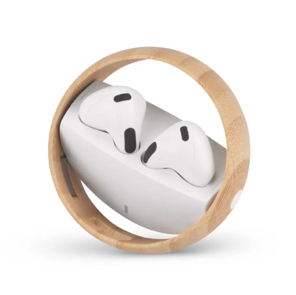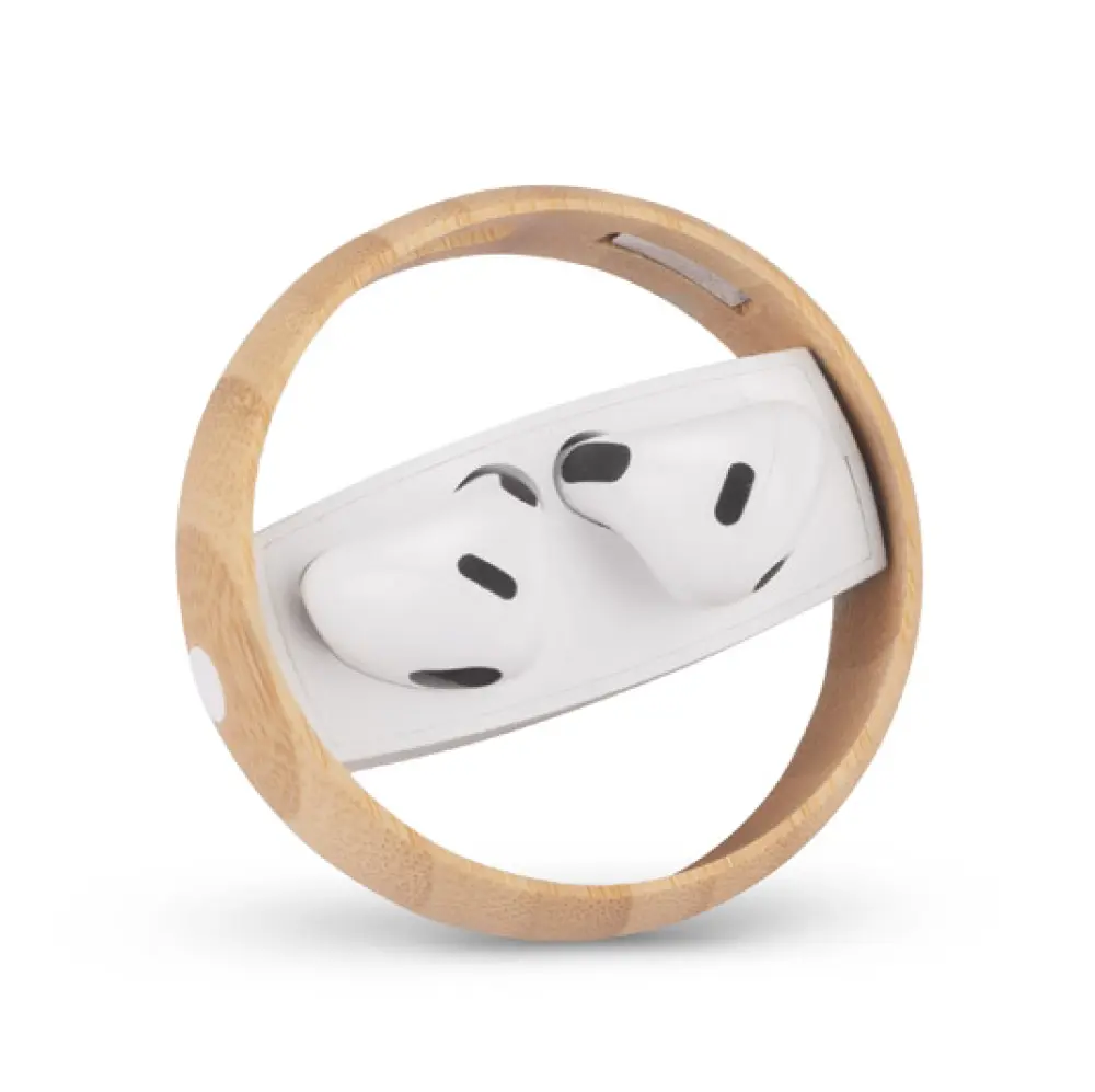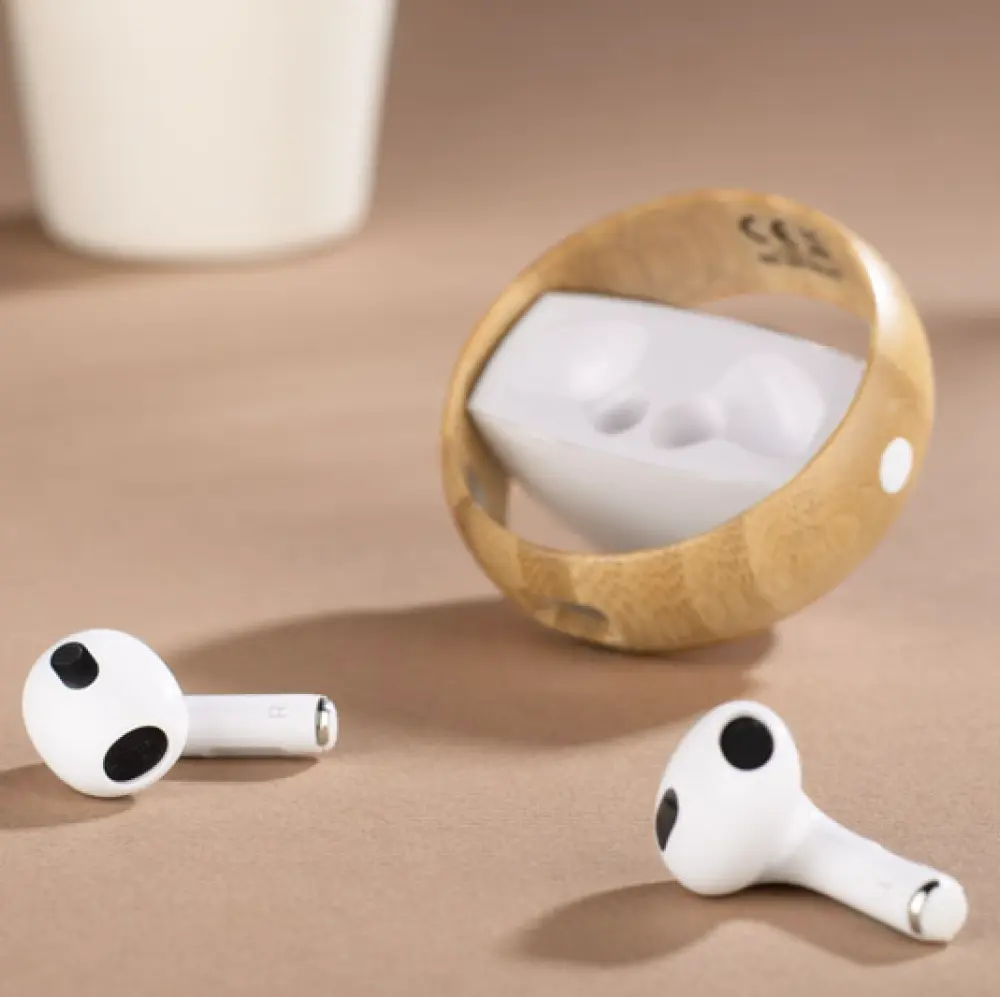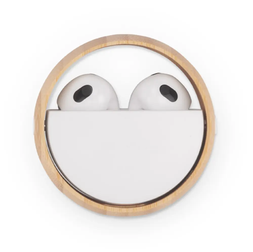 Bezprzewodowe słuchawki SPOTI to stylowy i nowoczesny gadżet. Zapakowany jest w wygodne okrągłe etui, które dzięki połączeniu bieli i bambusa wygląda bardzo efektownie. Wygodny niewielki rozmiar pozwoli cieszyć się wygodą użytkowania. Dane techniczne: bluetooth w wersji 5.0, pojemność baterii w każdej słuchawce 30 mAh, pojemność baterii w etui 230 mAh, czas pracy 3-4 godziny, czas ładowania 1-2 godziny, port ładowania typu C.