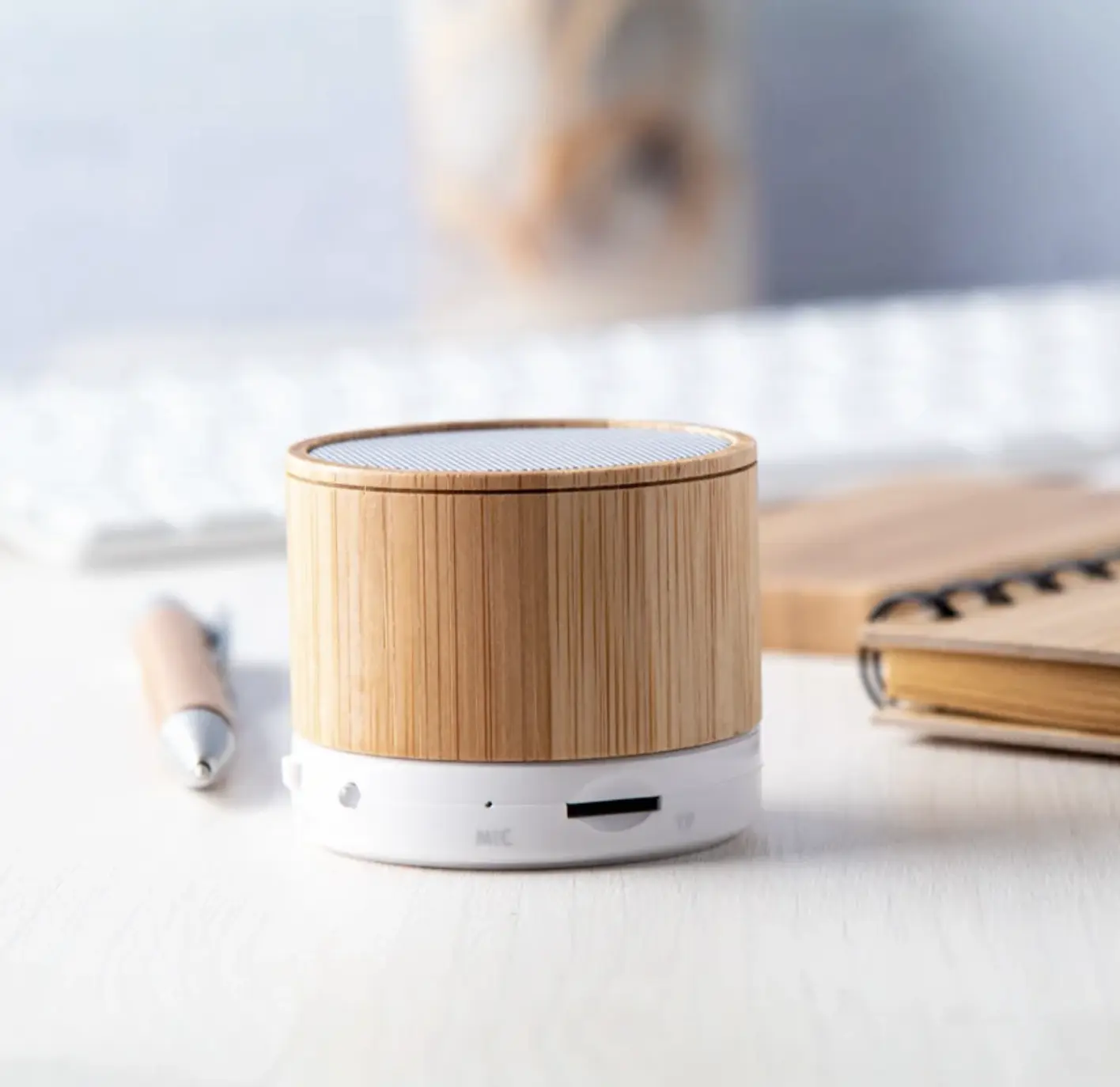 Głośnik Bluetooth w obudowie z naturalnego bambusa to stylowe i ekologiczne urządzenie, które łączy świetną jakość dźwięku z nowoczesnym designem. Doskonale prezentuje się w każdym wnętrzu — w domu, biurze czy podczas podróży.
