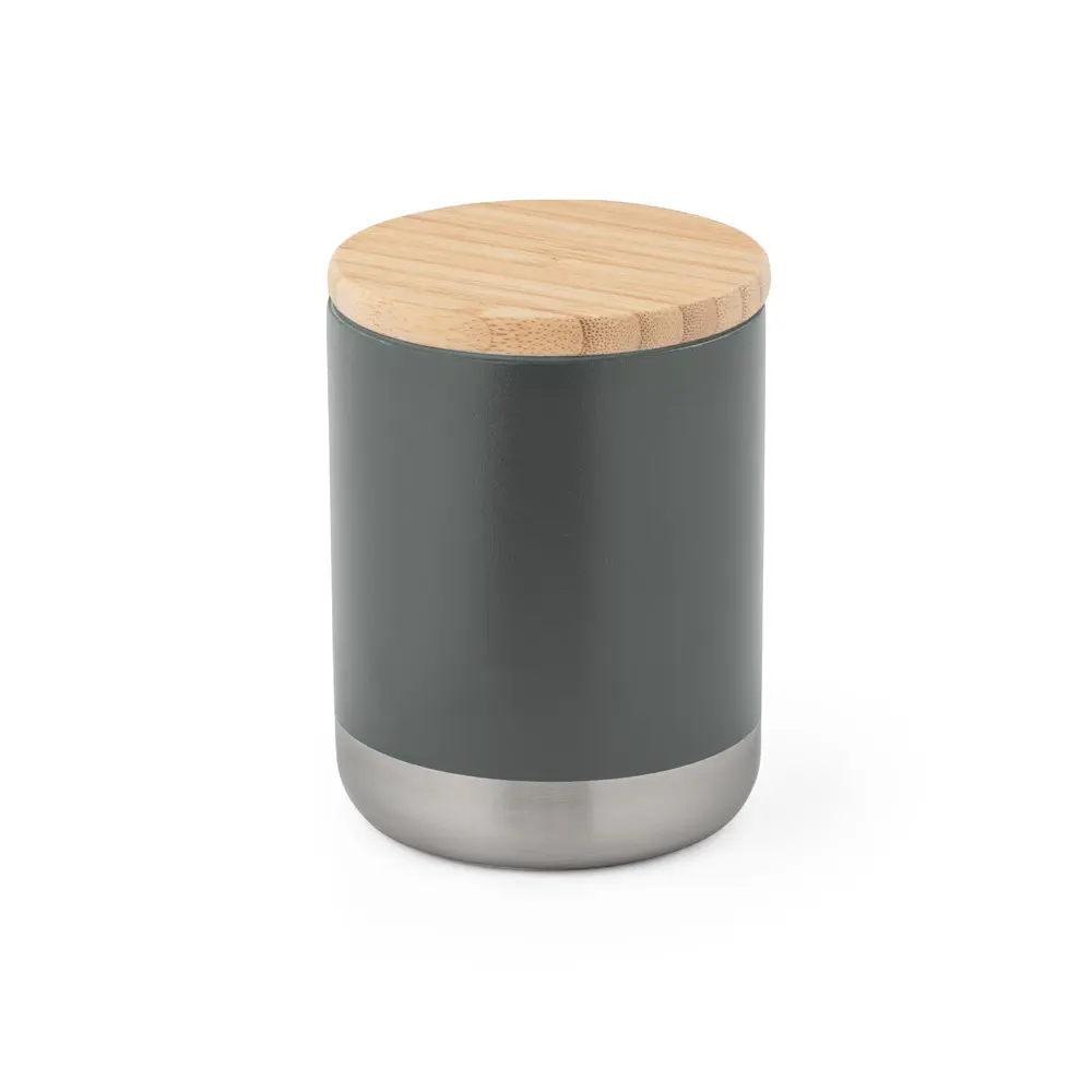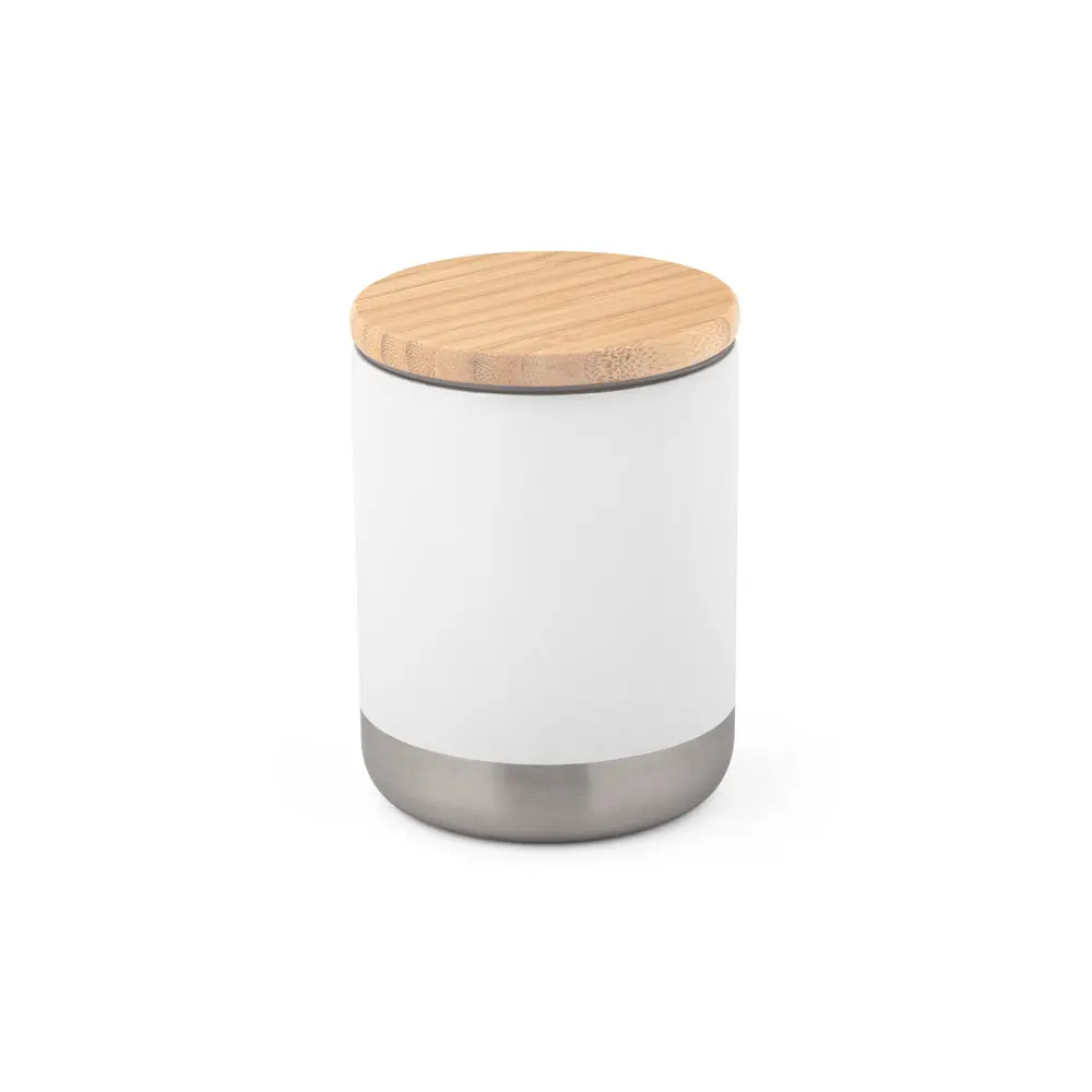 Dwuścienny kubek próżniowy ze stali nierdzewnej z miedziowaną ścianką wewnętrzną. Bambusowa pokrywka i silikonowy pierścień dla dodatkowej ochrony. Kubek ma pojemność do 370 ml i utrzymuje temperaturę napojów przez 5 godzin, a zimno przez 24 godziny.
