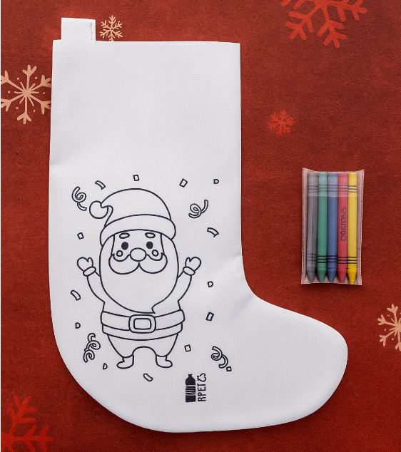 Zestaw zawiera eko skarpetę z włókniny RPET (materiał z recyklingu butelek PET ♻️) oraz 5 kolorowych kredek, dzięki którym każde dziecko może ozdobić ją według własnego pomysłu.