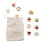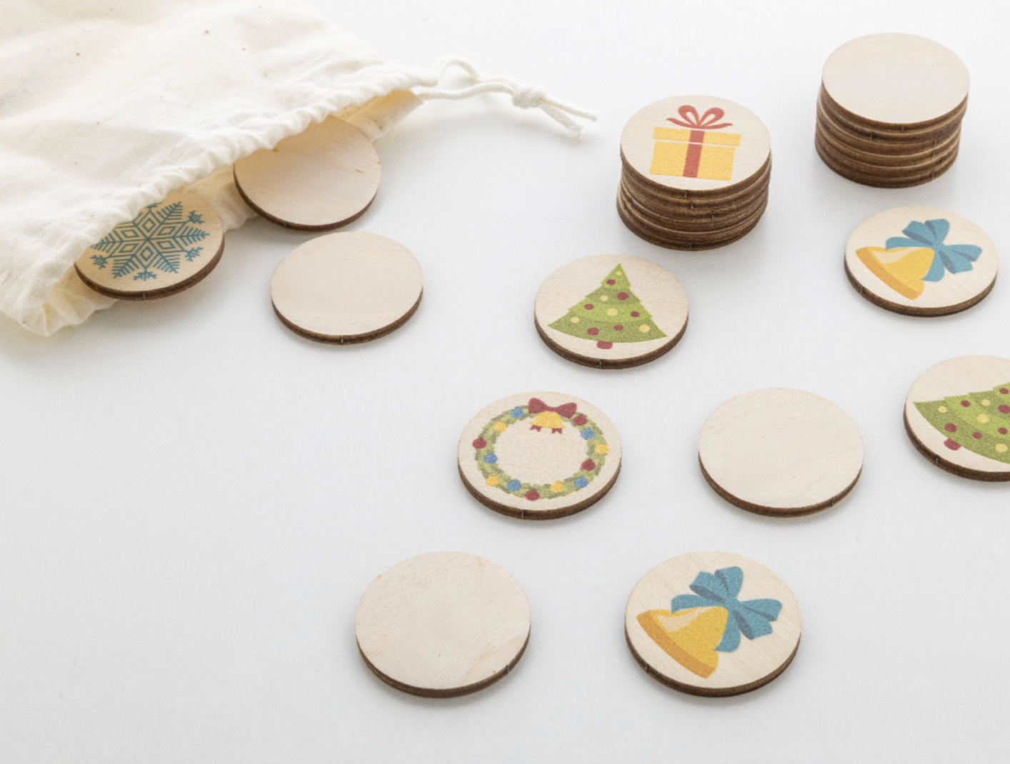 Ta świąteczna gra memory wykonana jest z laminowanej sklejki brzozowej i zapakowana w bawełniane etui. Zawiera 24 płytki (ø35 mm) z uroczymi motywami bożonarodzeniowymi.