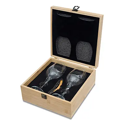 Zestaw składa się z dwóch eleganckich kieliszków do wina (310 ml) i korkociągu, starannie zapakowanych w piękne drewniane pudełko z bambusa. Kieliszki do wina wykonane są ze szkła o delikatnym kształcie, który podkreśla smak i aromat wina. To idealny prezent dla miłośników wina i eleganckich dodatków.