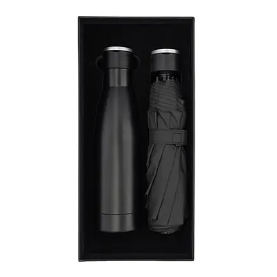 Biznesowy zestaw upominkowy składający się z butelki próżniowej i parasola. Całość zapakowana w eleganckie czarne pudełko. Dwuścienna butelka próżniowa ze stali nierdzewnej ze składanym uchwytem. Pojemność 500 ml. Parasol wykonany z materiału RPET, żebra z włókna szklanego. Zapakowany w wodoodporne etui.