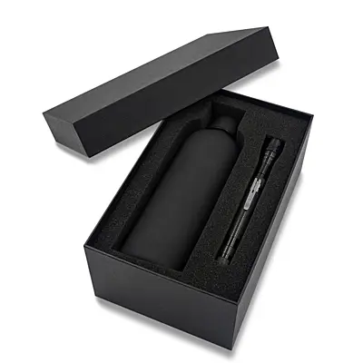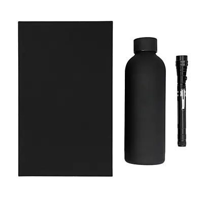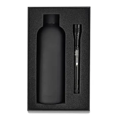 Zestaw upominkowy składający się z butelki próżniowej i latarki. Butelka ma pojemność 500 ml. Wewnętrzna ścianka wykonana z wysokiej jakości stali 18/8, zewnętrzna ze stali 18/0 z przyjemną w dotyku powłoką. Utrzymuje temperaturę powyżej 40°C do 15 godzin. Wysuwana metalowa latarka o długości 38,5 cm z 3 białymi diodami LED o mocy 10 lumenów. Wyposażona w klips i magnesy na obu końcach. Zasilana 4 bateriami AG13 (w zestawie). Całość w eleganckim pudełku prezentowym.