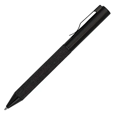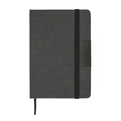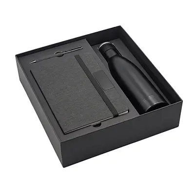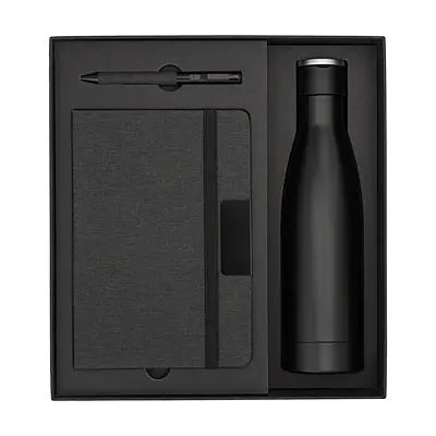 Zestaw składający się z butelki próżniowej, notatnika i długopisu. Całość zapakowana w eleganckie czarne pudełko. Dwuścienna butelka próżniowa ze stali nierdzewnej ze składanym uchwytem. Utrzymuje temperaturę powyżej 40°C do 15 godzin. Pojemność 500 ml. Notatnik A5, twarda okładka wykonana z tkaniny RPET, ozdobiona czarnym metalowym elementem; 80 kwadratowych kartek, gramatura 70 g/m². Metalowy długopis ozdobiony materiałem RPET. Niebieski wkład 1,0 mm.