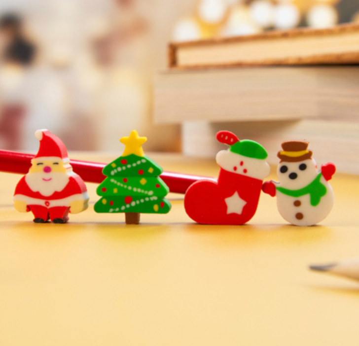 Ten uroczy zestaw 4 gumek do ścierania ozdobionych świątecznymi motywami to idealny upominek dla dzieci, uczniów i wszystkich miłośników świąt. Gumki zapakowane są w bawełniane etui ze sznurkiem, które nadaje całości eleganckiego i ekologicznego charakteru.