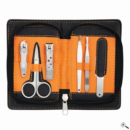 Consists of six items: nail file, tweezers, cuticle nippers, nail nippers, manicure scissors, toenail nippers, in a zippered case, sewn with colored threads and with a metal plate