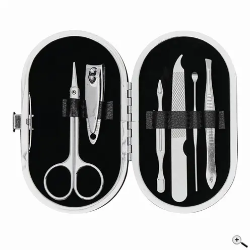 The set includes scissors, tweezers, nippers, a manicure stick, a file, a manicure spatula, in a purse with a button fastener.