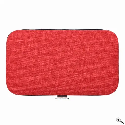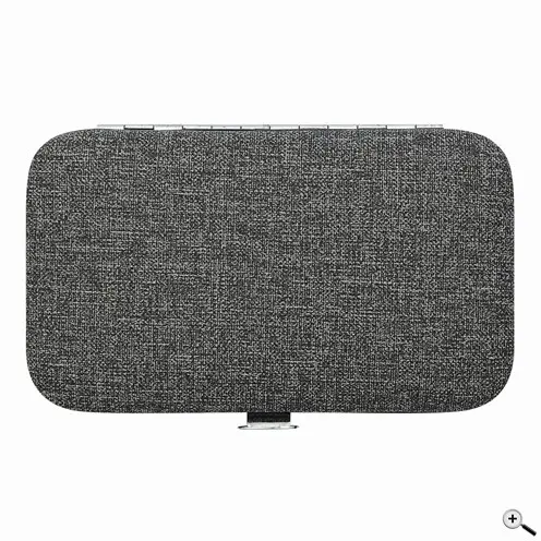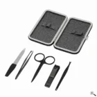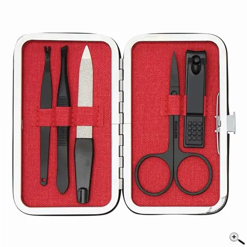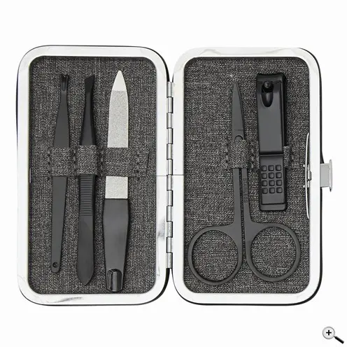 It consists of 5 components: a nail file, tweezers, a trimmer for removing cuticles, manicure scissors, tweezers, in a rectangular case, a button on the side.