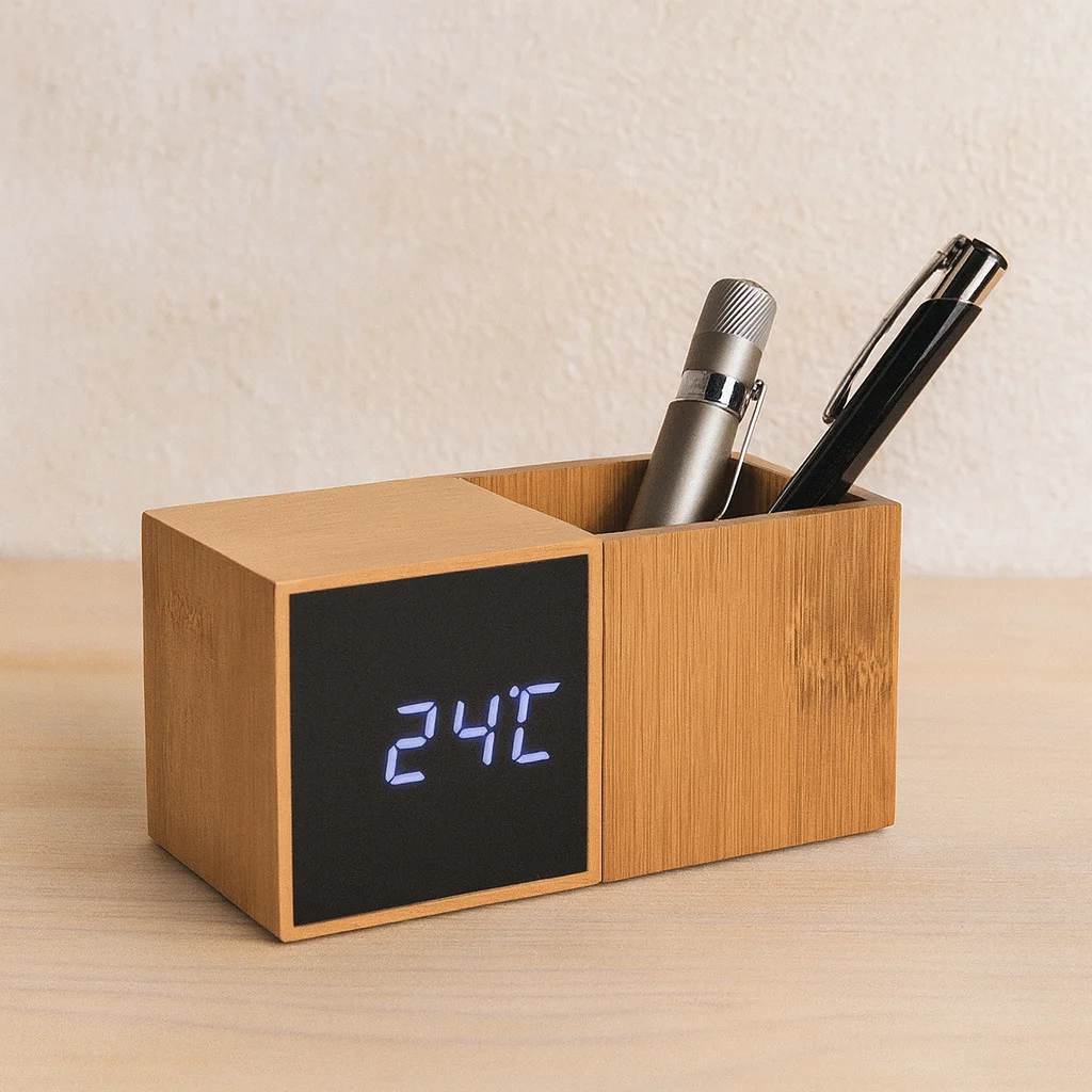 The “Bamboo” desk clock with organizer is ideal for people who value environmental friendliness, organization and style in their daily lives. The target audience includes office workers, students, eco-conscious individuals and those looking for original gifts.
